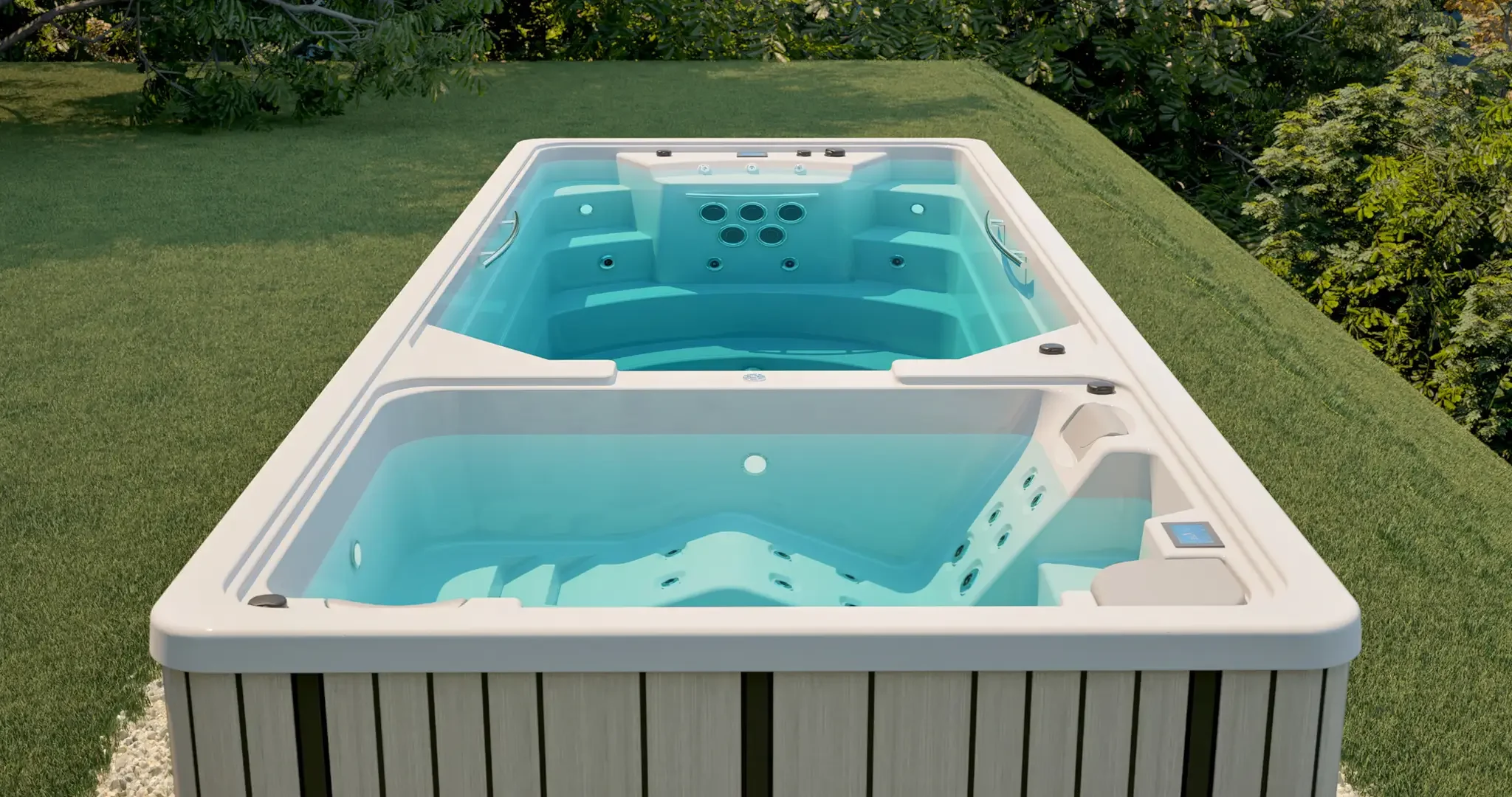 Dive into an oasis of well-being with the Aquavia Spa Duo swimspa . This innovative pool with hot tub combines two independent spaces: one to enjoy counter-current swimming and aquafitness , and another to immerse yourself in the world of hydromassage .