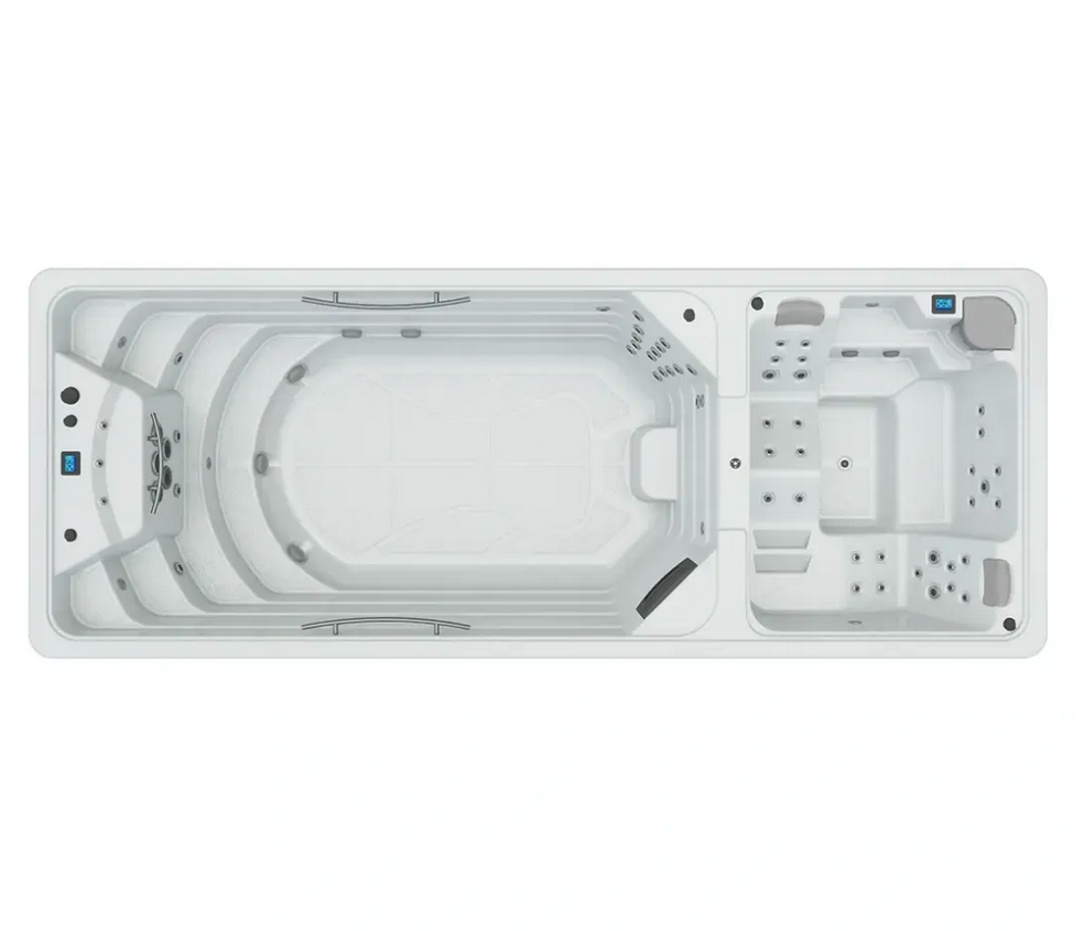 Dive into an oasis of well-being with the Aquavia Spa Duo swimspa . This innovative pool with hot tub combines two independent spaces: one to enjoy counter-current swimming and aquafitness , and another to immerse yourself in the world of hydromassage .
